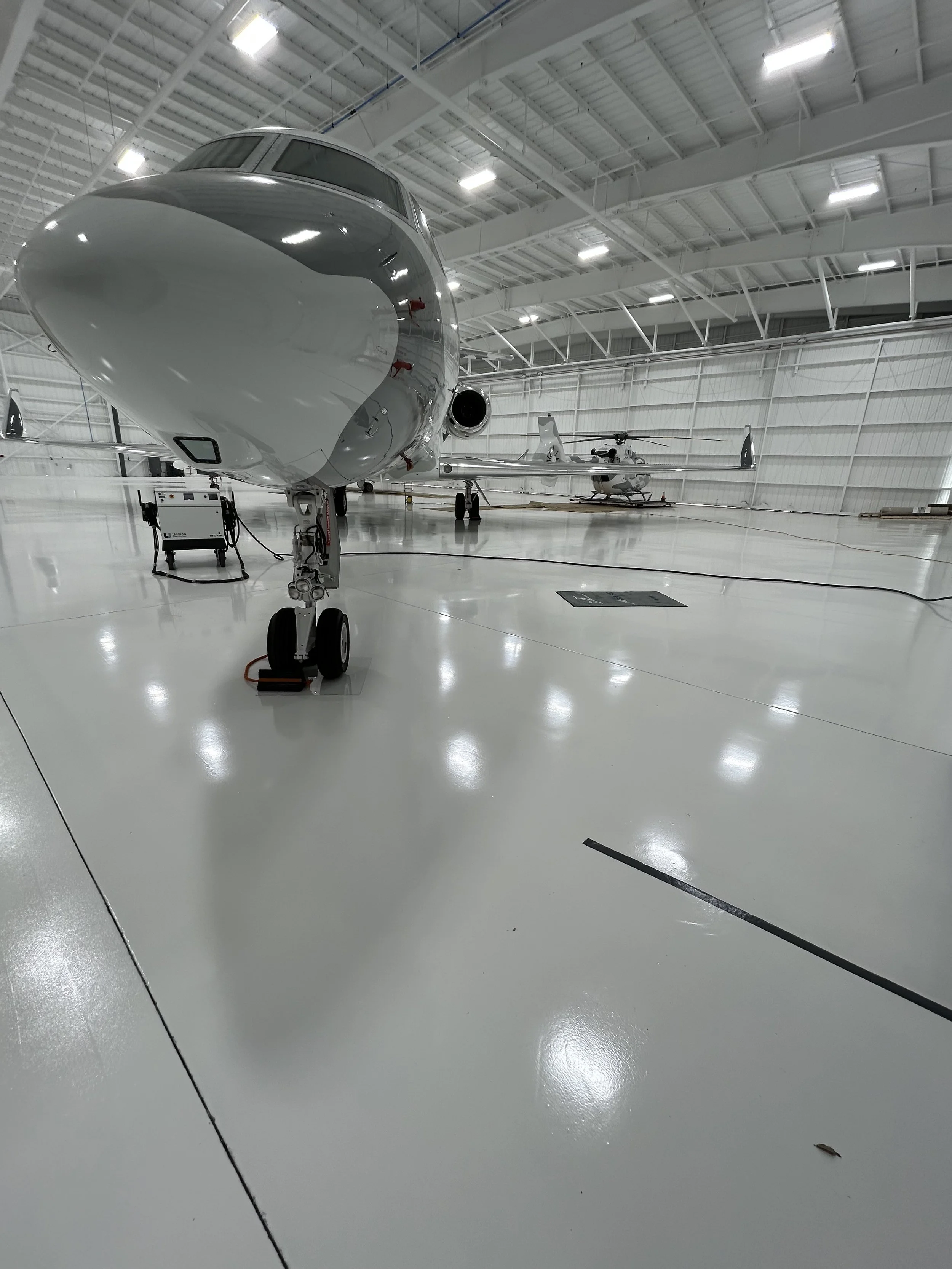 After curing under controlled temperature and humidity, a clear topcoat is applied the enhance durability, chemical resistance, and gloss